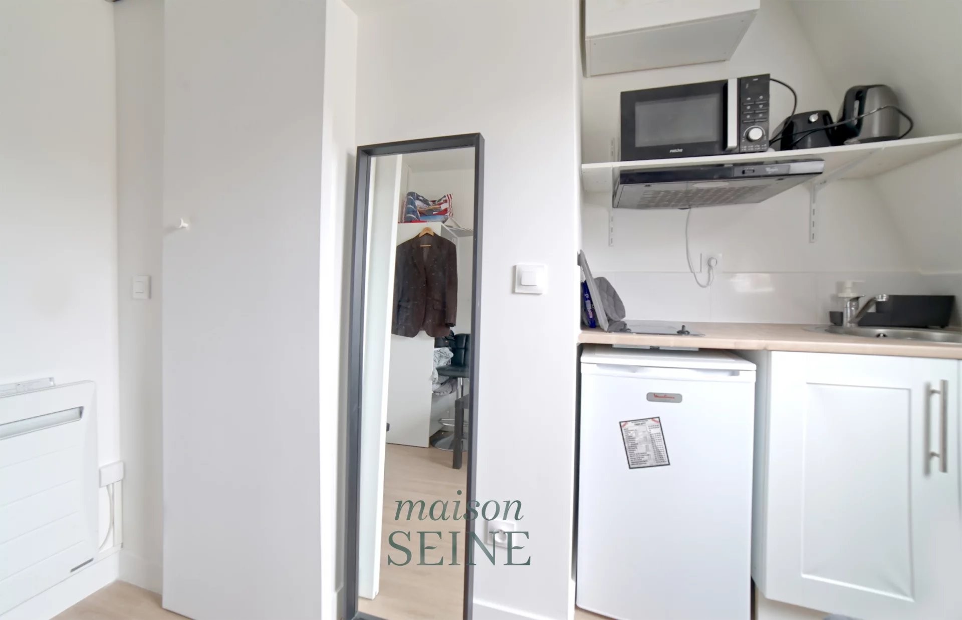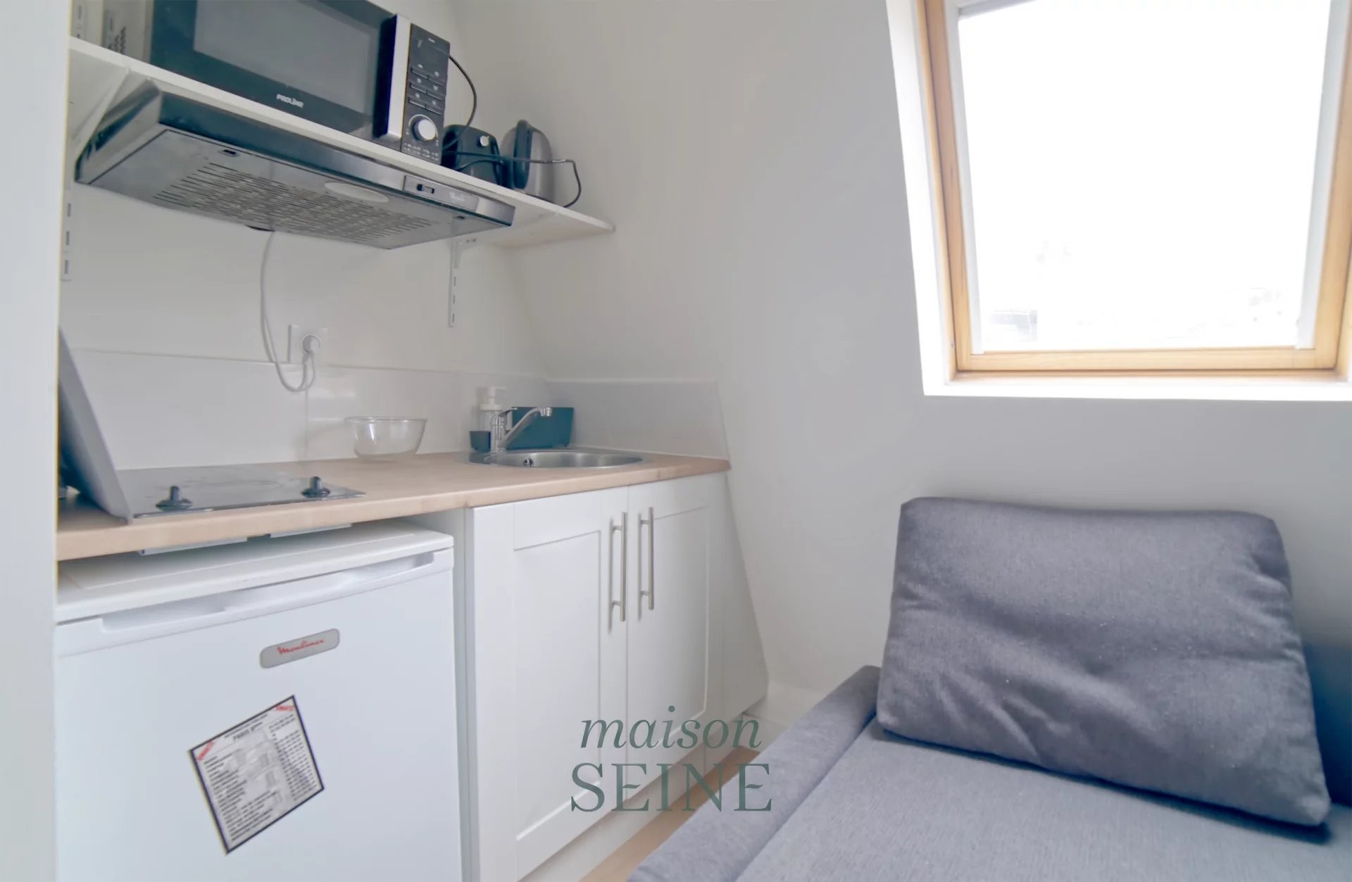 Idéalement situé à proximité immédiate de la Mairie du 8ème arrondissement et de la Place Saint Augustin, au 5ème étage sans ascenseur d'un très bel immeuble ancien de standing, cette chambre de service de 9,05 m² carrez (10,77 m² au sol) se compose d'une entrée avec porte blindée, une pièce de vie avec belle fenêtre offrant une vue dégagée sur les toits de Paris et le ciel, un espace kitchenette entièrement équipée, une salle de douche avec toilette.